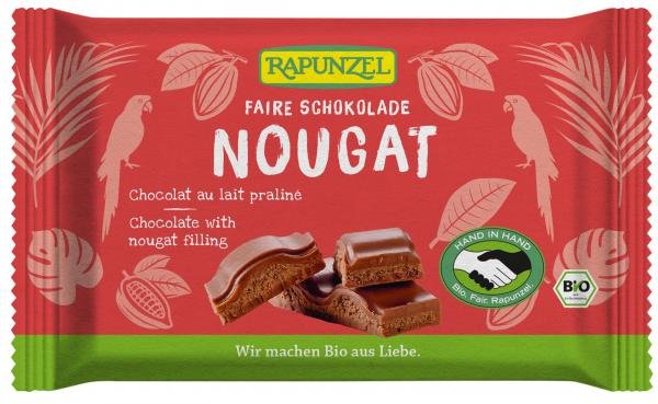 Vollmilchschokolade mit cremiger Nougat-Füllung und herrlich zarter Schmelz - fair gehandelt von Rapunzel HAND IN HAND-Partnern. Das intensive Conchieren ist neben den wertvollen Rohstoffen das eigentliche Geheimnis des wahren Schokoladengenusses. Durch die Kunst des Conchierens entwickelt sich der anfänglich noch verborgene Reichtum an kakaoeigenen Aromen Stufe um Stufe bis zur vollen Entfaltung. Gleichzeitig entsteht vollkommene Feinheit und der unvergleichlich zarte Schmelz.