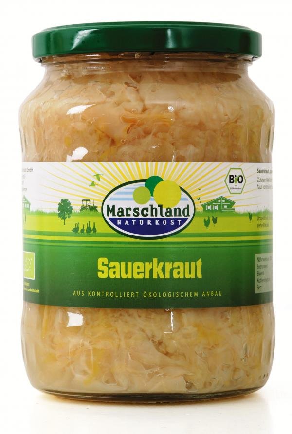In annähernd gleichmäßige Streifen geschnittener biologischer Weißkohl, aus dem Sauerkraut durch natürliche Milchsäuregärung nach Zusatz von Meersalz entstanden ist, welches durch Pasteurisation im luftdicht verschlossenen Behältnis dauerhaft haltbar gemacht worden ist.