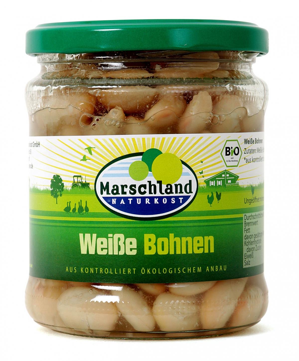 Tafelfertig zubereitete biologische Weiße-Bohnen, die durch Zusatz eines leicht gesalzenen Aufgusses und durch Sterilisation im luftdicht verschlossenen Behältnis dauerhaft haltbar gemacht worden ist.