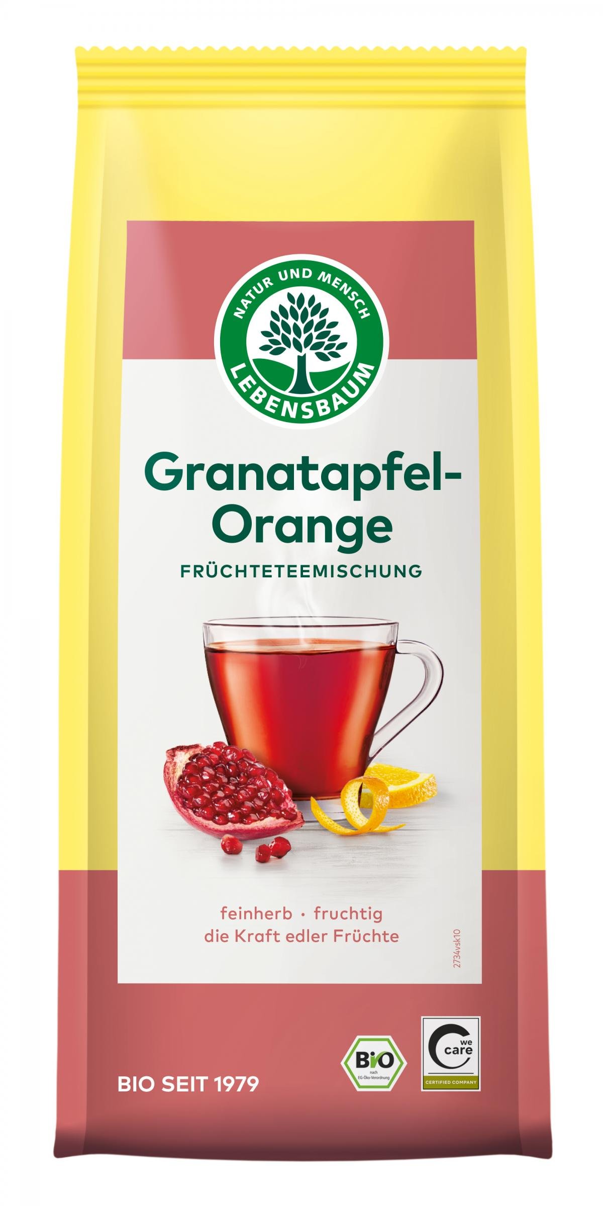 Orange und Granatapfel geben in unserer Mischung den Ton an. Honigbusch, Hibiskus, Apfel und süßes Brombeerblatt runden diesen orange-rot schimmernden Tee harmonisch ab. Sowohl Orangen als auch Granatäpfel sind alte Kulturpflanzen mit asiatischen Wurzeln. Sie werden seit Jahrhunderten wegen ihrer edlen farbintensiven Früchte und ihrer duftenden Blüten verehrt. Genießen Sie diese gelungene Komposition.