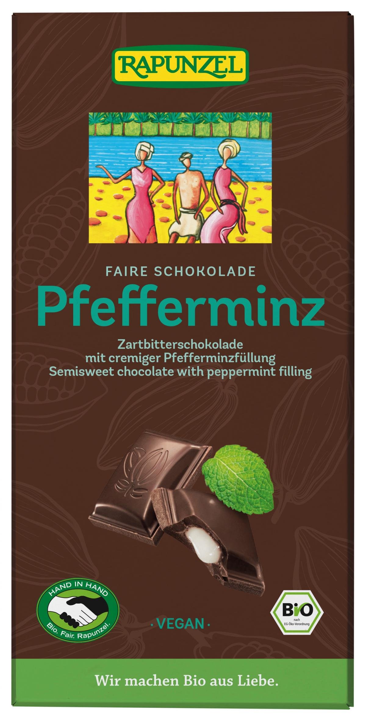 Diese erfrischende Zartbitterschokolade mit cremiger Pfefferminz-Füllung ist eine unwiderstehliche Komposition für alle Minz-Fans. Tipp für die Sommermonate: Lagern Sie diese Schokolade im Kühlschrank für den besonderen Frischekick. Fair gehandelt von Rapunzel HAND IN HAND-Partnern. Das intensive Conchieren ist neben den wertvollen Rohstoffen das eigentliche Geheimnis des wahren Schokoladengenusses. Durch die Kunst des Conchierens entwickelt sich der anfänglich noch verborgene Reichtum an kakaoeigenen Aromen Stufe um Stufe bis zur vollen Entfaltung. Gleichzeitig entsteht vollkommene Feinheit und der unvergleichlich zarte Schmelz.