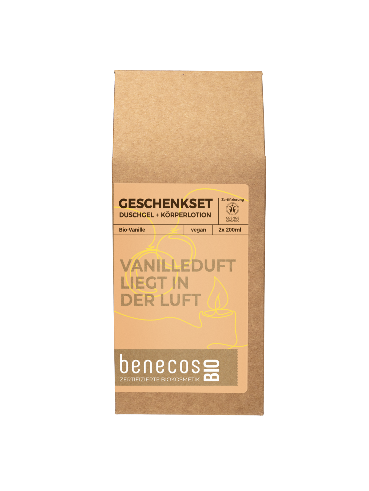 Das Pflegeset, bestehend aus Duschgel und Körperlotion, in der limitierten Winteredition, erinnert mit seinem warmen Vanilleduft an cozy Leseabende vor dem Kamin mit einer heißen, weißen Schokolade. Dank schützendem Bio-Vanilleextrakt, regionalem Bio-Apfelsaft, reichhaltiger Bio-Sheabutter und pflanzlichen Tensiden pflegt es die Haut streichelzart.